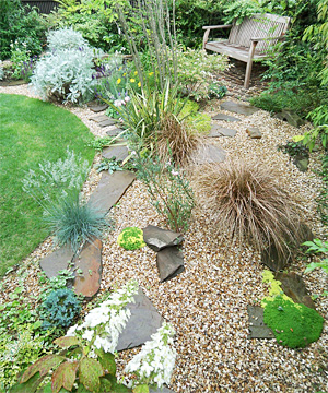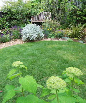 2007年 リニューアル。正方形に近い庭の中央に楕円形の緩やかな築山の芝生。その周りを乾いたイメージの石と砂利、草花、木々が囲むユニークな構成。芝生を中心に、周囲に植栽された花や実、紅葉の変化を四季折々楽しめる。