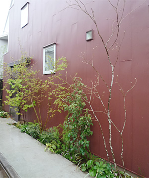 2009年シンプルで個性的な玄関の両サイドにスリットを設けて樹木や草花を配置。限られた面積から伸びやかに溢れる植物は四季折々変化する。