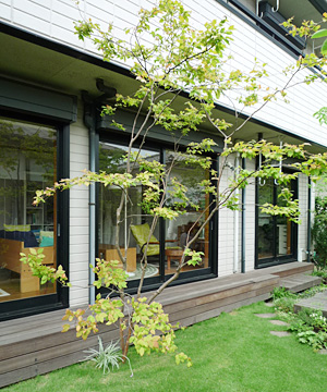 2009年 リニューアル。植物とハードウッド材の構成で、芝生とデッキが分断されないように、デッキを低く、植栽の中の島にして庭全体に溶け込む工夫をした。