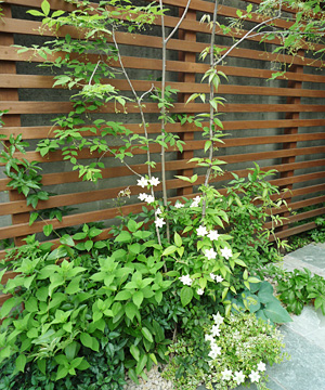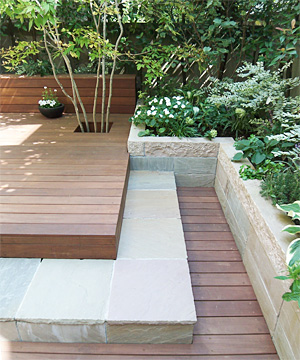 2008年 砂岩の自然石材とハードウッド材の段差による組み合わせの庭。砂岩は、ステップと花壇、階段に、ハードウッドは、フェンス、デッキ、ベンチ、室外機カバーと、それぞれがいろいろな用途の段差によって構成されている。地面の植栽スペースを極力少なくし、日頃のメンテナンスを楽にしている。