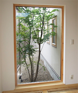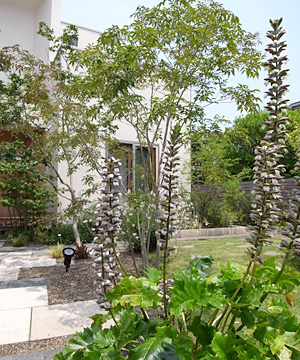 2007年 新築。広々とした庭を、石敷き、芝、砂利通路に分け、御影石敷きでラインを出すことですっと伸びる奥行き感を出している。玄関付近には斜めに広がる百日紅を、室内から見える窓の前にはヤマモミジを植えた。