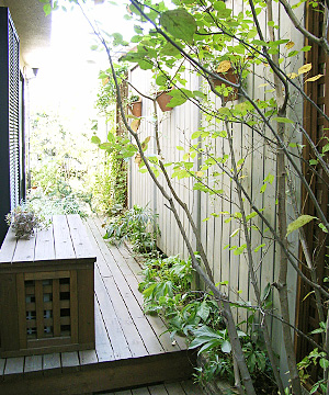2003年 リニューアル。玄関前の小さなスペースにはレンガで立ち上がりを付け、シンボルツリーと下草を。オリジナルアイアン製の門扉、表札とデザインを合わせたフェンスが個性を出す。細長い庭は、木フェンスとデッキを主として使いやすさとプライベート感を出す。スリットをレンガで立ち上げ花壇に。ヤマボウシと下草を植え込み潤いを出した。